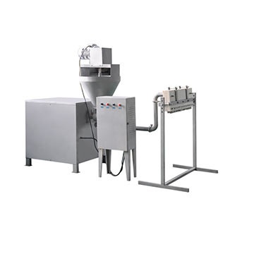 將肉泥添加一定量的淀粉蛋白粉等營(yíng)養(yǎng)成分,經(jīng)過(guò)擠壓成型,成為長(zhǎng)條狀肉條,通過(guò)更換模具可生產(chǎn)多種尺寸的肉條。