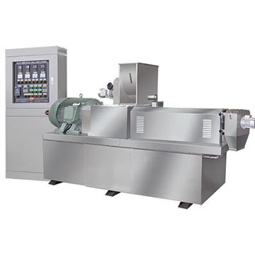物料在機(jī)筒中經(jīng)過(guò)螺桿的擠壓剪切和混煉,物料在高溫高壓下充分熟化經(jīng)出口模具膨化,形成各種形狀的食品。
