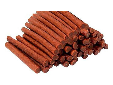 肉條以肉類為主要原料添加一定量的淀粉蛋白粉等營養(yǎng)成分經(jīng)過擠壓成型,成為長條形細幫,經(jīng)過高溫烘烤成為像香腸一樣的肉條。我公司的肉條生產(chǎn)線工藝簡單,使用方便靈活,可以方便地改變?nèi)鈼l的尺寸,適合生產(chǎn)狗貓等寵物的高檔食品。
